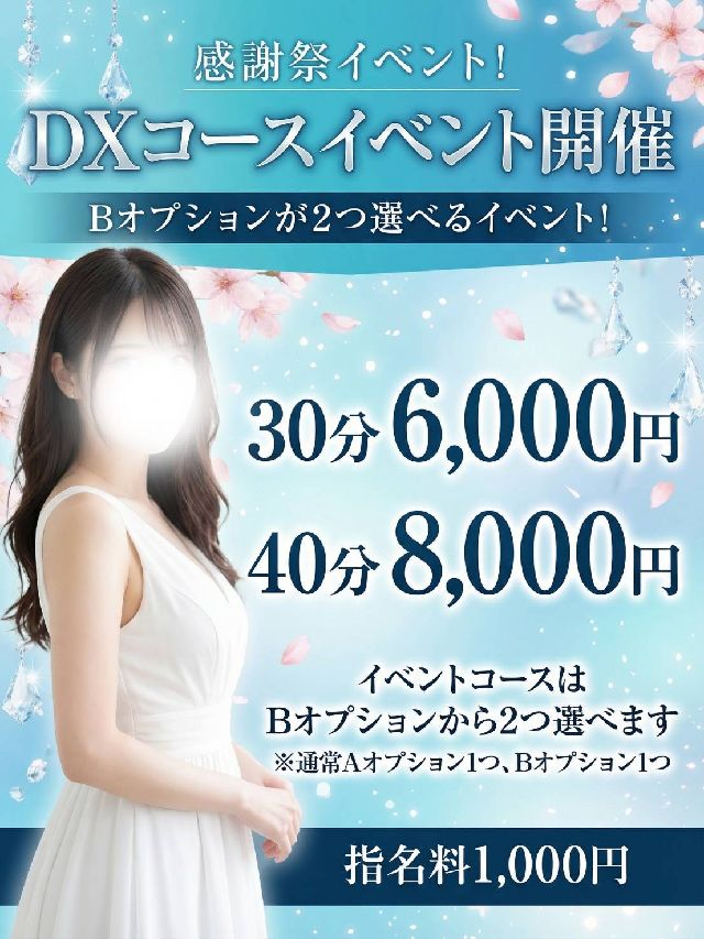 [03/29 12:00]♡♡感謝祭イベント!♡♡ ♡日頃の感謝を込めて♡ なんと!DXコースをご利用の場合 Bオプションが2つ選べます! ①イベント30分 6,000円 手コキ+Bオプション2つ+時間内発射無制限 ②イベント40…